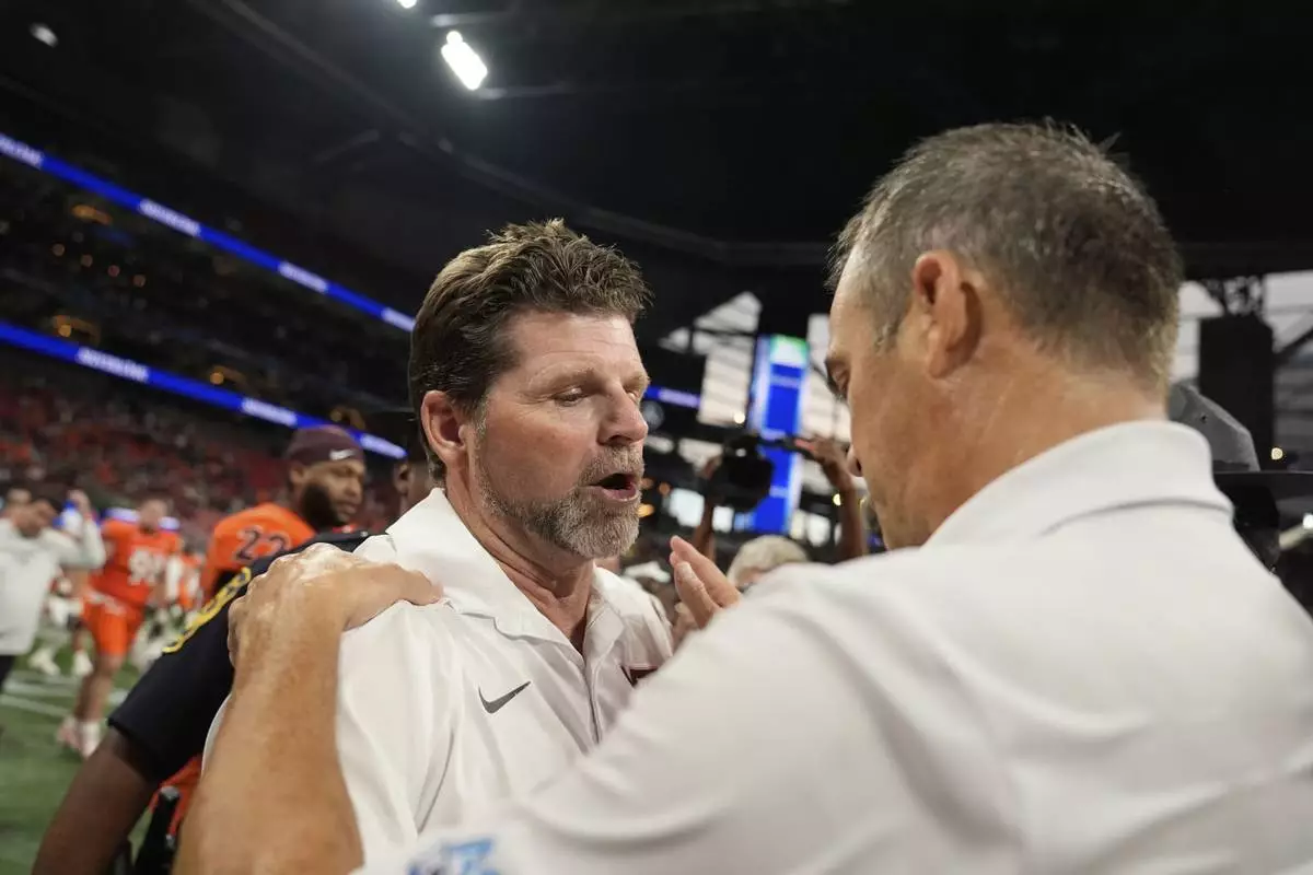 Virginia Tech head coach Brent Pry meets South Carolina head coach Shane Beamer after an NCAA college football game, Sunday, Aug. 31, 2025, in Atlanta. (AP Photo/Brynn Anderson)