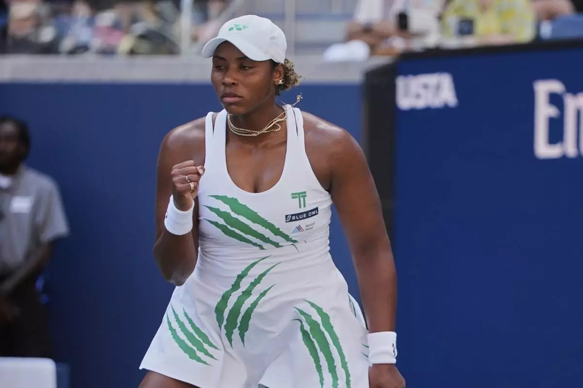 Taylor Townsend, of the United States, reacts after winning a game against Barbora Krejcikova, of the Czech Republic, during the fourth round of the U.S. Open tennis championships, Sunday, Aug. 31, 2025, in New York. (AP Photo/Pamela Smith)