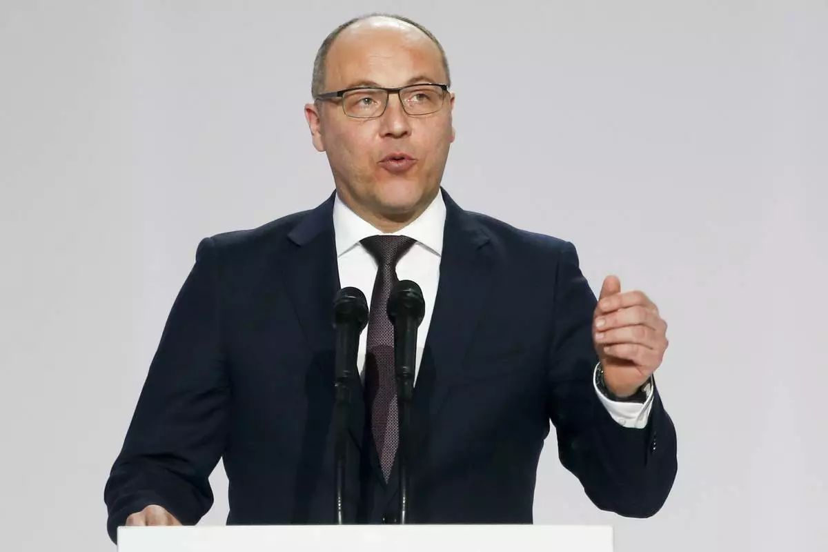 FILE - Ukrainian parliament speaker Andriy Parubiy speaks in Kiev, Ukraine, Tuesday, Jan. 29, 2019. (AP Photo/Efrem Lukatsky, file)