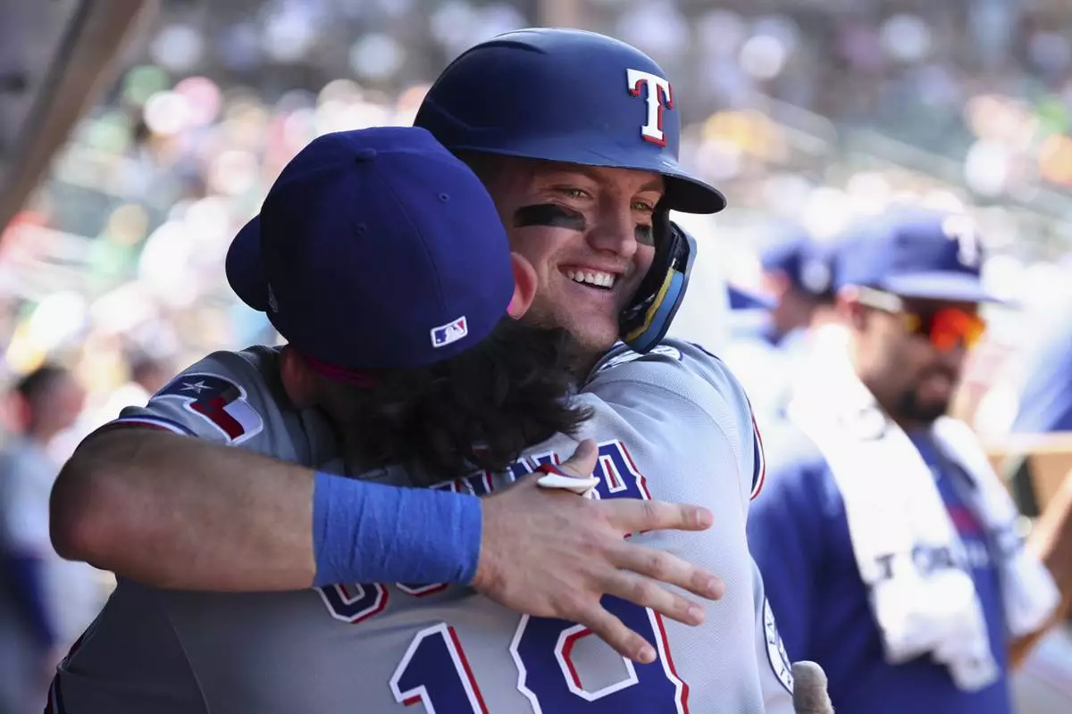 Texas Rangers' Josh Jung, right, hugs Alejandro Osuna, left, after hitting a solo home run during the second inning of a baseball game Sunday, Aug. 31, 2025, in West Sacramento, Calif. (AP Photo/Sara Nevis)