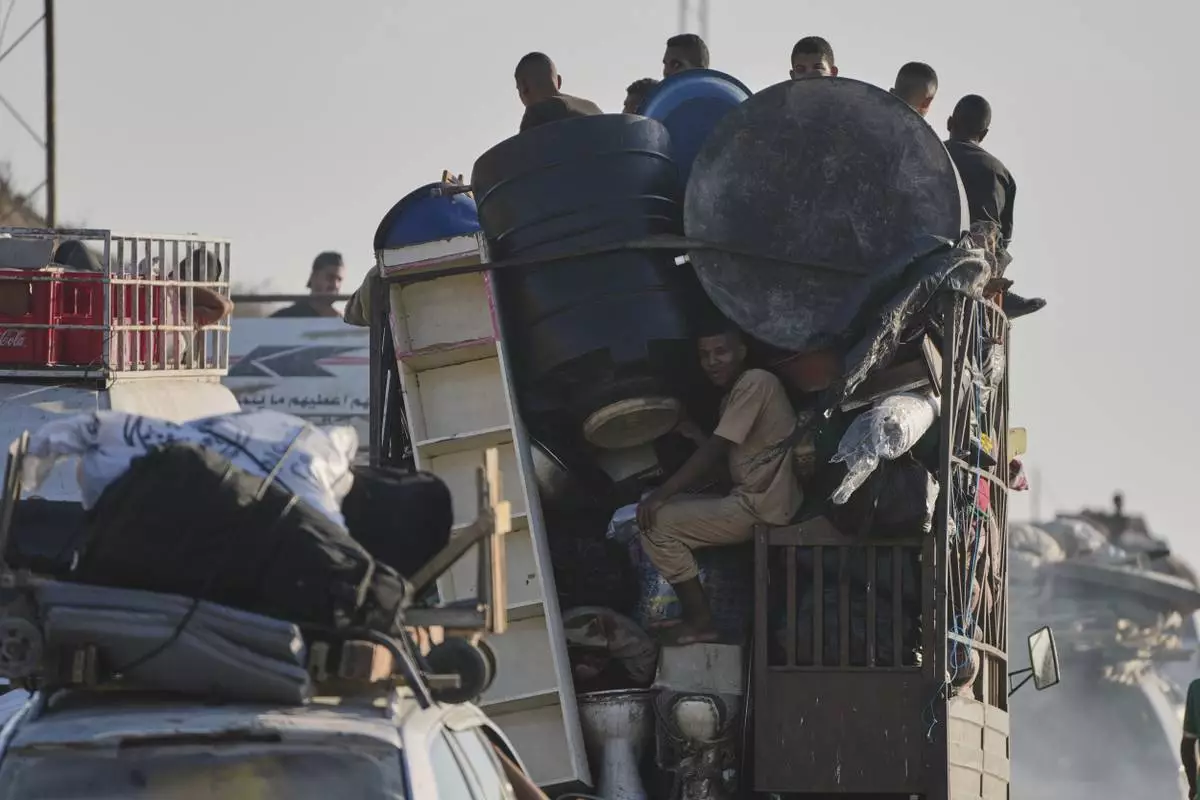Displaced Palestinians fleeing northern Gaza Strip move with their belongings along the Sea Road, near Wadi Gaza, Saturday, Aug. 30, 2025. (AP Photo/Abdel Kareem Hana)