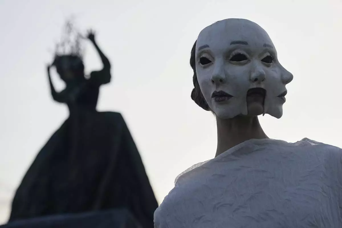 A model wears a creation by Russian brand Mandragora on a runway at the Moscow Fashion Week on the Floating Bridge at Zaryadye park in Moscow, Russia, Friday, Aug. 29, 2025. (AP Photo/Pavel Bednyakov)