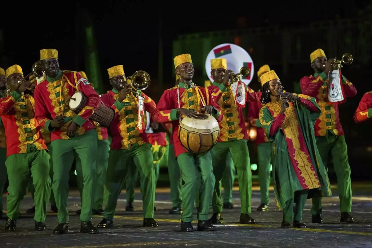 Members of The Presidential Orchestra of Burkina Faso perform during the closing ceremony of the Spasskaya Tower International Military Music Festival in Red Square in front of the St. Basil Cathedral in Moscow, Russia, on Sunday, Aug. 31, 2025. (AP Photo/Alexander Zemlianichenko)