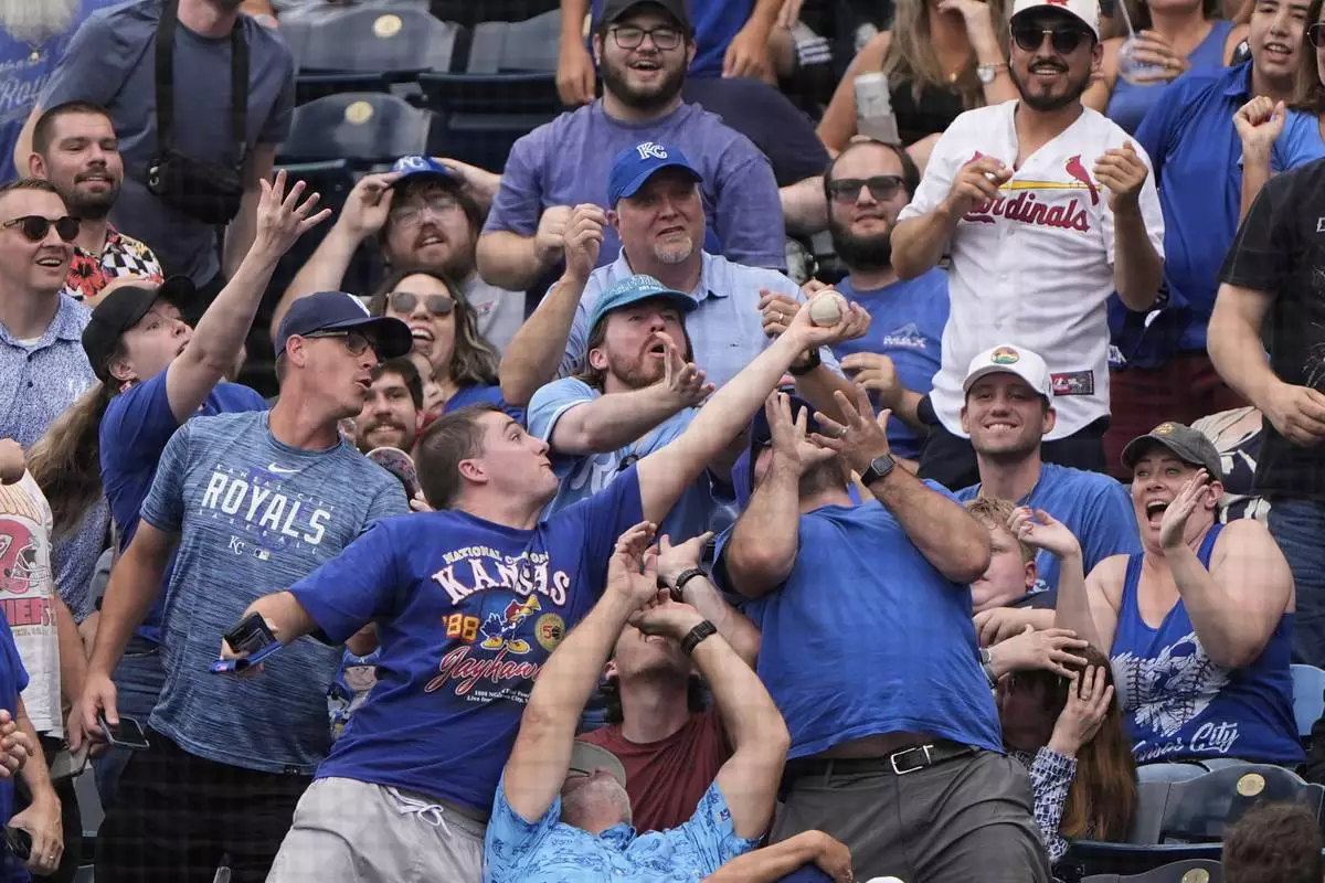 Fans try to catch a foul ball hit by Detroit Tigers' Andy Ibanez during the eighth inning of a baseball game against the Kansas City Royals, Sunday, Aug. 31, 2025, in Kansas City, Mo. (AP Photo/Charlie Riedel)