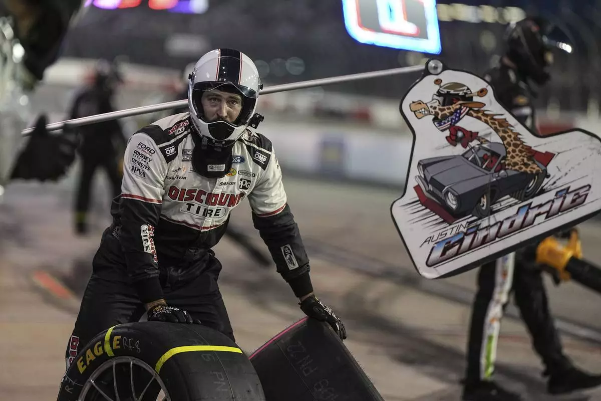 A pit crew member for Austin Cindric prepares for a pit stop during a NASCAR Cup Series auto race at Darlington Raceway, Sunday, Aug. 31, 2025, in Darlington, S.C. (AP Photo/Matt Kelley)