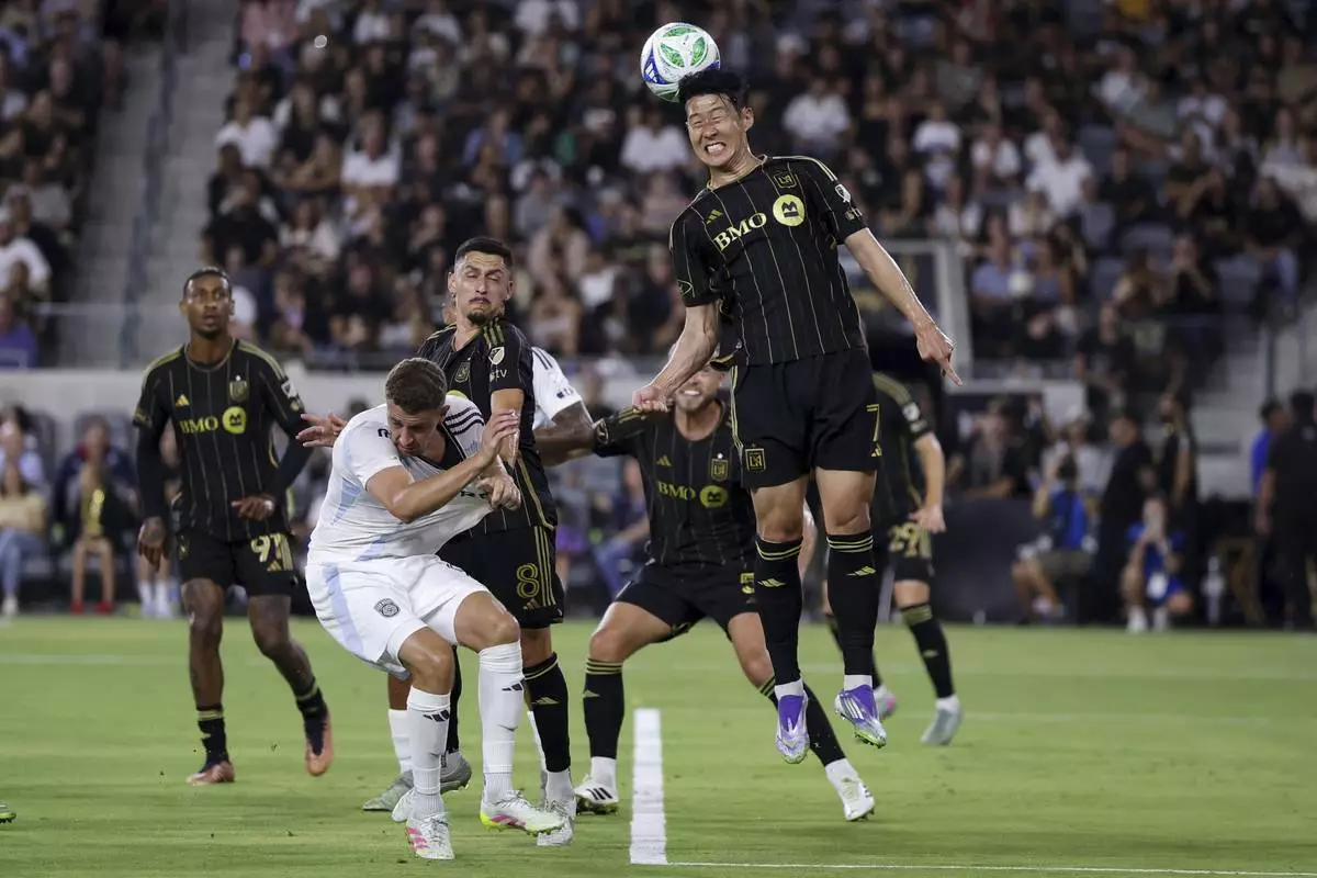 Los Angeles FC forward Son Heung-Min, front right, heads the ball during the first half of an MLS soccer match against San Diego FC, Sunday, Aug. 31, 2025, in Los Angeles, Calif. (AP Photo/Eric Thayer)