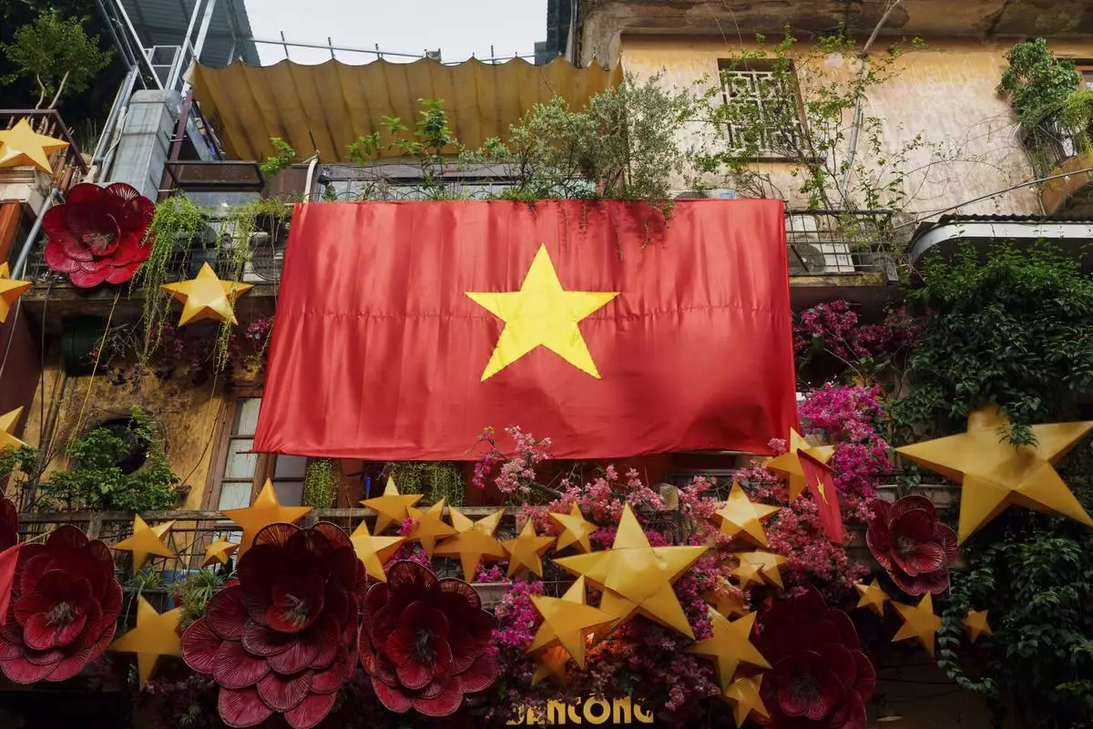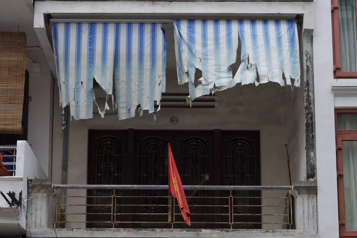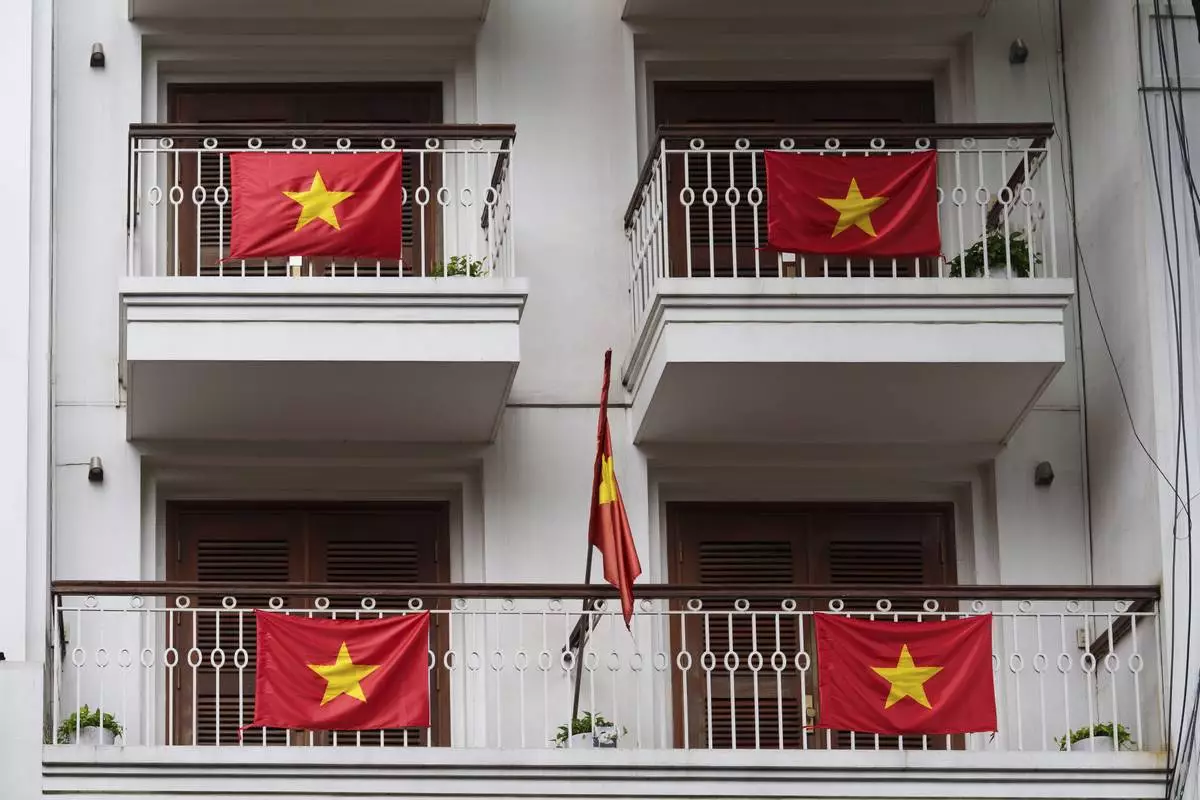 A Vietnamese national flag flies from a balcony in the old quarter of Hanoi, Vietnam, Sunday, Aug. 31, 2025. (AP Photo/Vincent Thian)