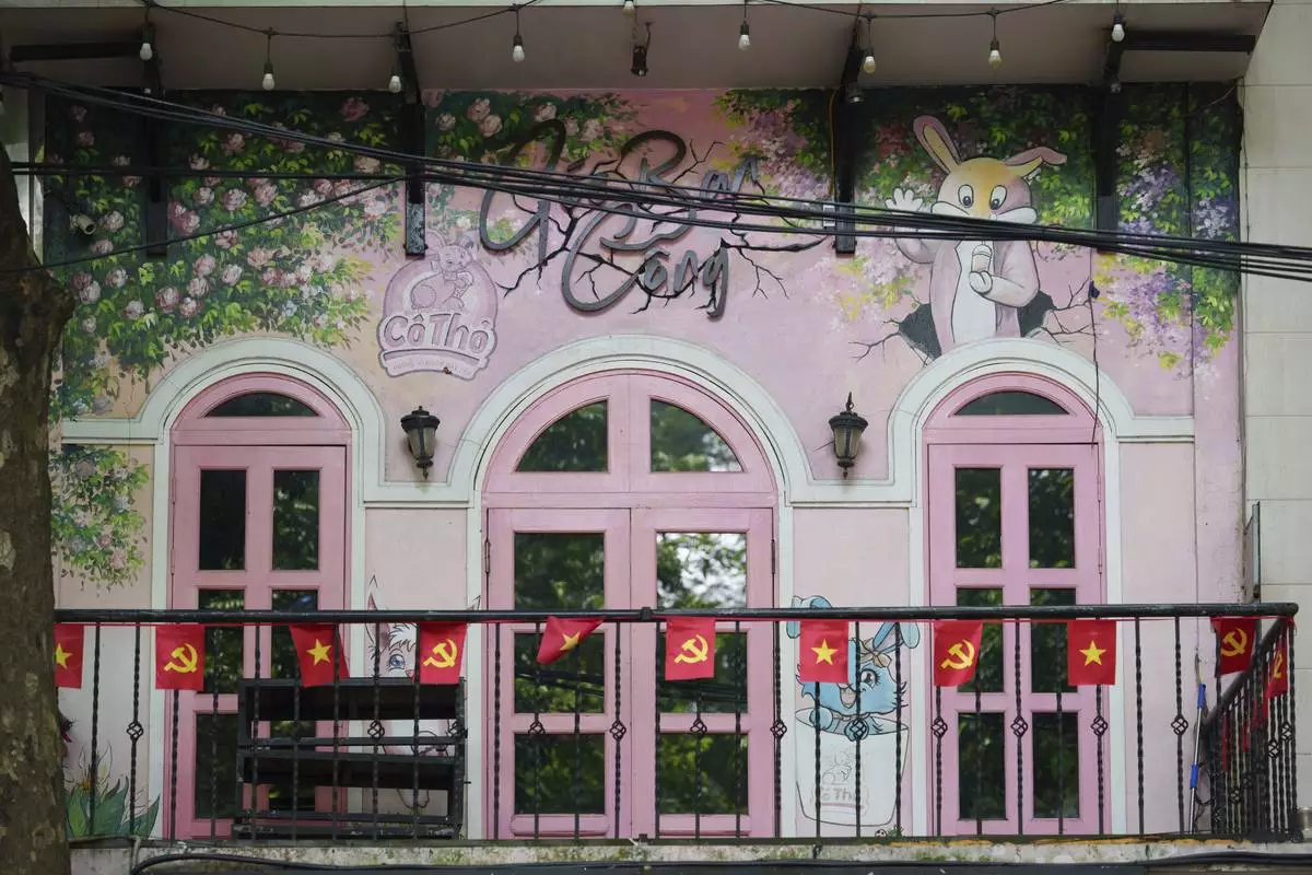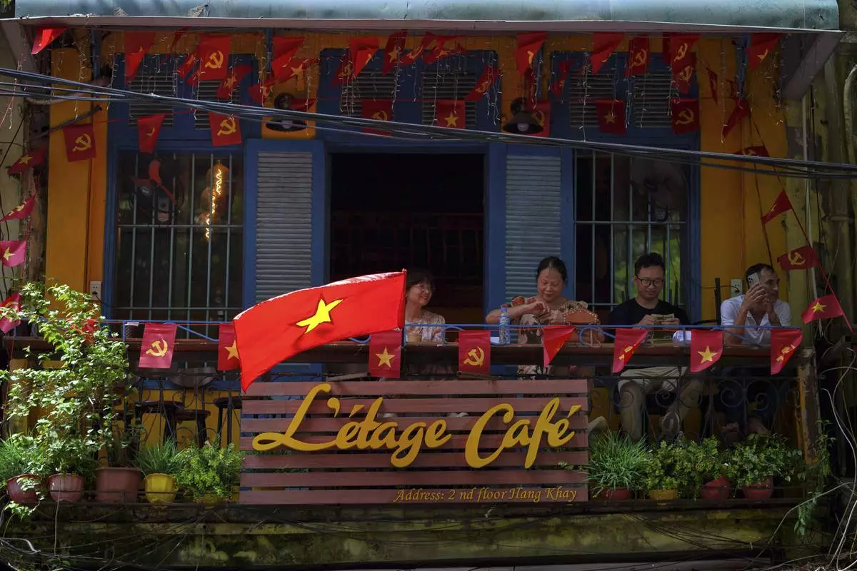Vietnamese national flags decorate the exterior of a cafe in the old quarter of Hanoi, Vietnam, Sunday, Aug. 31, 2025. (AP Photo/Vincent Thian)