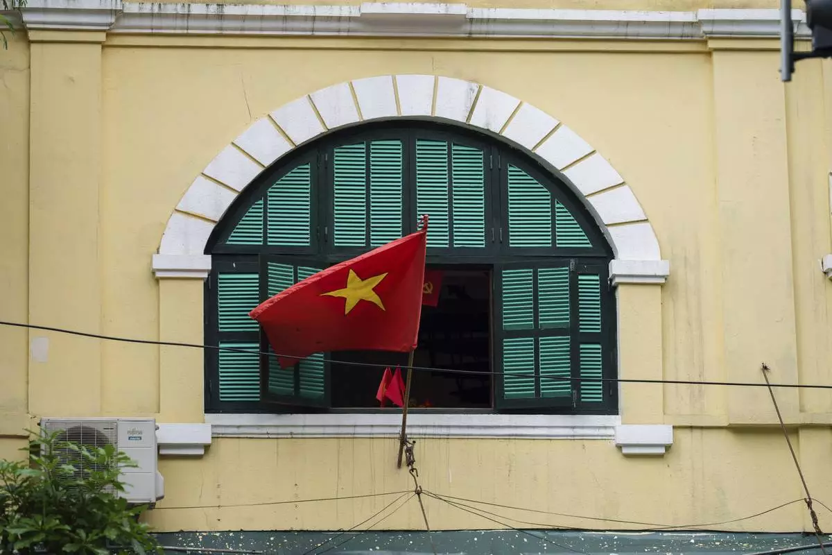 A Vietnamese national flag flies outside a window in the old quarter of Hanoi, Vietnam, Sunday, Aug. 31, 2025. (AP Photo/Vincent Thian)