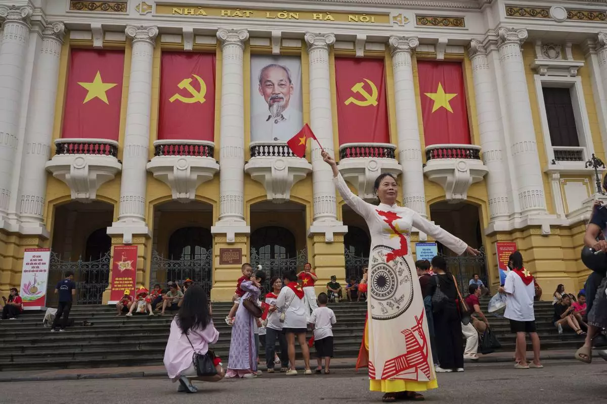 A Vietnamese woman stands for a photograph in front of the Opera House, its balconies decorated with Vietnamese and communist flags in the old quarter of Hanoi, Vietnam, Monday, Sept. 1, 2025. (AP Photo/Vincent Thian)