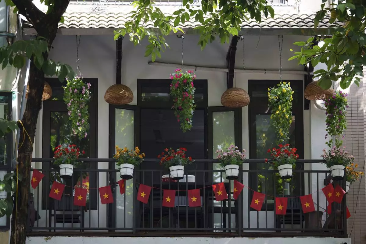 Vietnamese national flags decorate a balcony in the old quarter of Hanoi, Vietnam, Sunday, Aug. 31, 2025. (AP Photo/Vincent Thian)