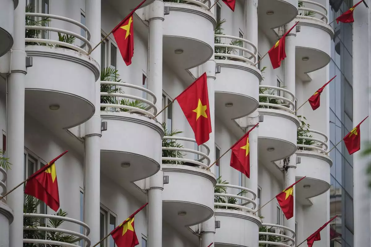 Vietnamese national flags fly from balconies of a hotel in Hanoi, Vietnam, Monday, Sept. 1, 2025. (AP Photo/Vincent Thian)
