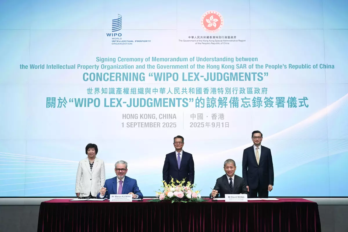 The Hong Kong Special Administrative Region Government today (September 1) signed a Memorandum of Understanding (MOU) with the World Intellectual Property Organization (WIPO) on co-operation with regard to the WIPO Lex-Judgments database to strengthen information sharing, with a view to jointly building a more connected and informative global intellectual property (IP) community.