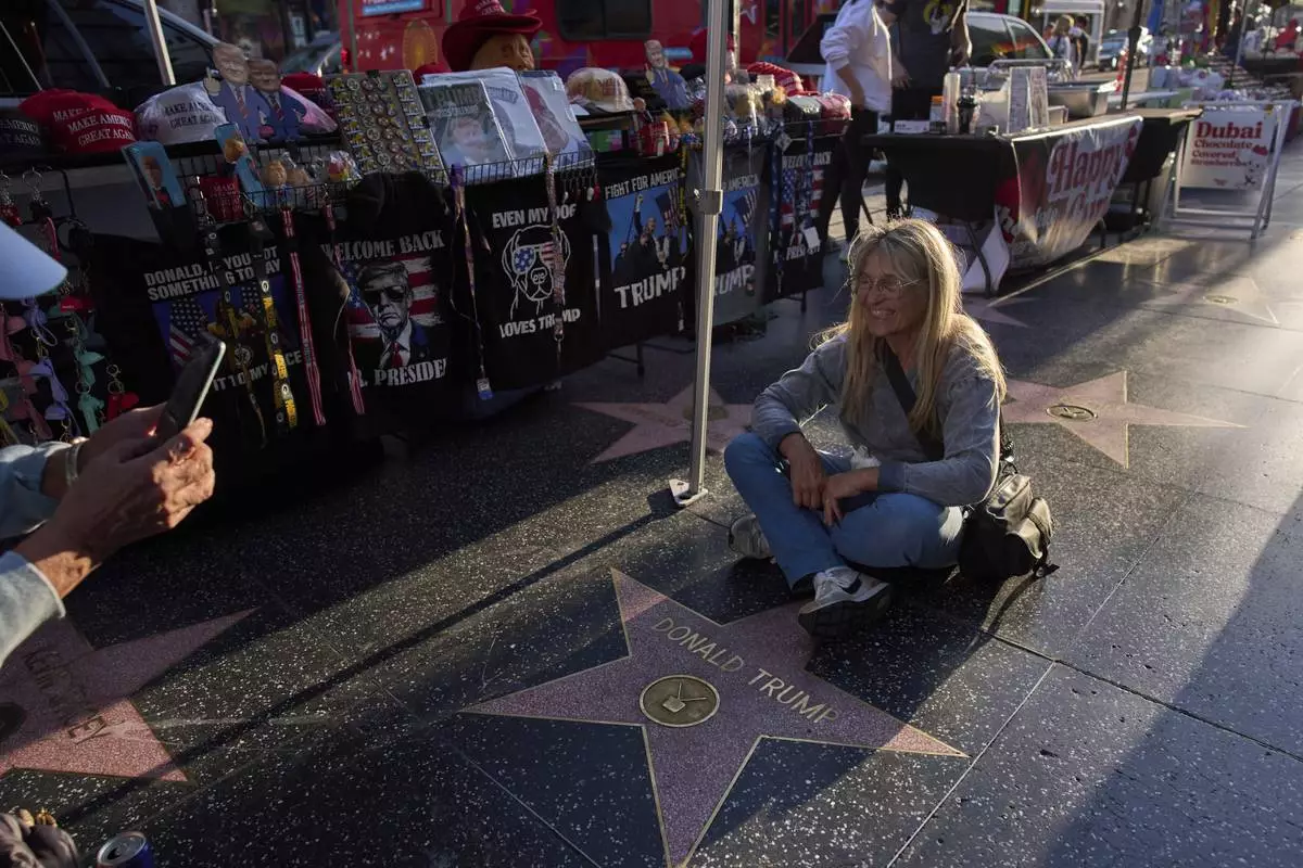 FILE - Silvia Camino, visiting from Argentina, takes photos with the Donald Trump star on the Hollywood Walk of Fame in Los Angeles, Friday, April 4, 2025. (AP Photo/Jae C. Hong, File)