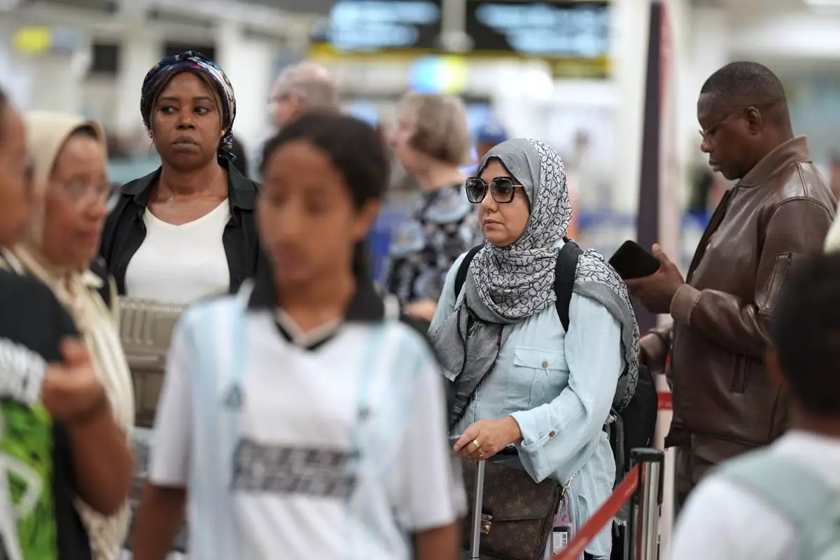 Travelers check in for international flights in the Miami International Airport at the start of the Labor Day weekend, Friday, Aug. 29, 2025, in Miami. (AP Photo/Rebecca Blackwell)
