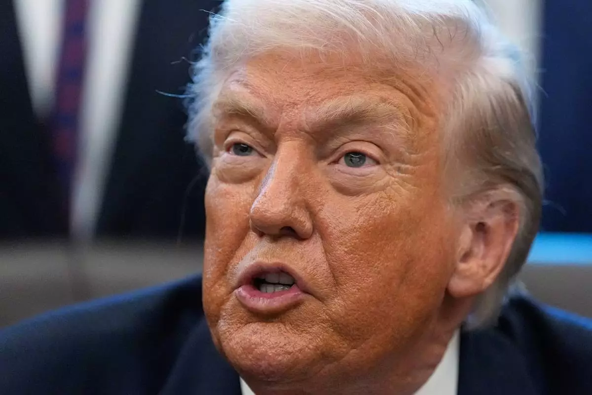 President Donald Trump answers questions after signing a bill that returns whole milk to school cafeterias across the country, in the Oval Office of the White House, Wednesday, Jan. 14, 2026, in Washington. (AP Photo/Alex Brandon)