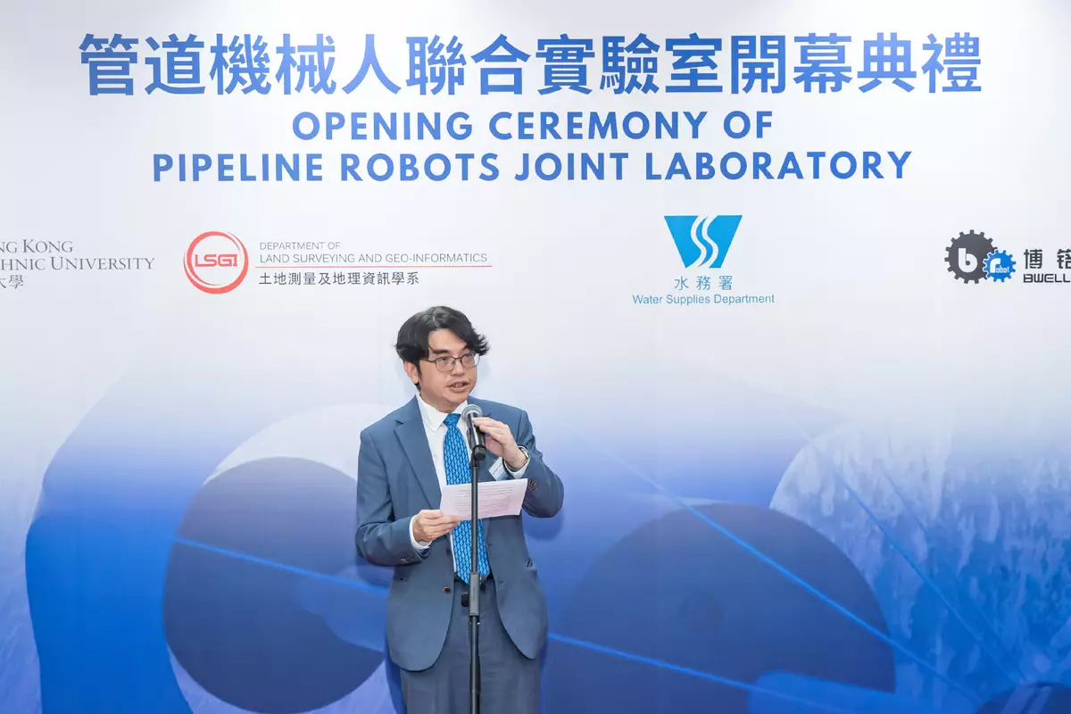 In his speech at the ceremony, the Director of Water Supplies, Mr Roger Wong, stated that the WSD has committed to collaborating with various institutions to develop and apply advanced technologies in driving the development of smart water in Hong Kong. The WSD is actively exploring innovative methods to enhance the skills and efficiency of water mains inspections. The WSD expects that, through the Pipeline Robots Joint Laboratory, the development of robots for operating in diverse pipeline conditions will be accelerated. This will enable highly accurate inspections, thereby reducing the risks of pipe bursts and leaks, and potentially extending to monitoring water quality.