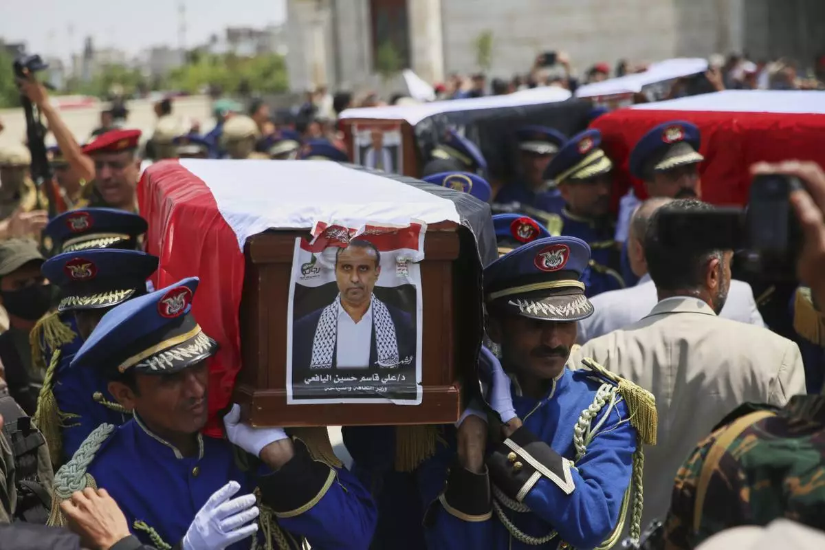 Footage showed 11 coffins with individual photos of the killed officials on each and wrapped in Yemeni flags.