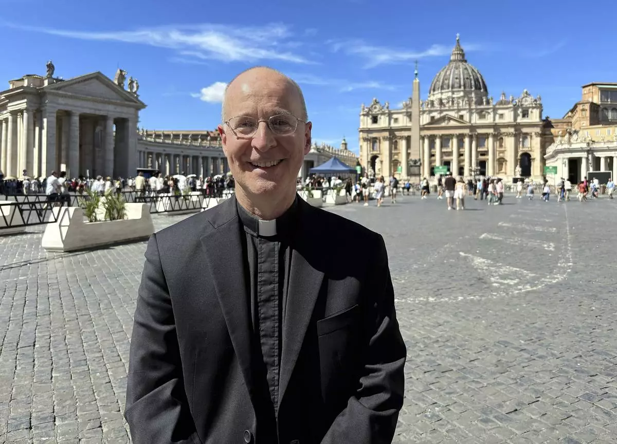 Rev. James Martin, a New York-based Jesuit, poses for a photograph during an interview with The Associated press just outside St. Peter's Square in Rome, Monday, Sept. 1, 2025. (AP Photo/Maria Selene Clemente)