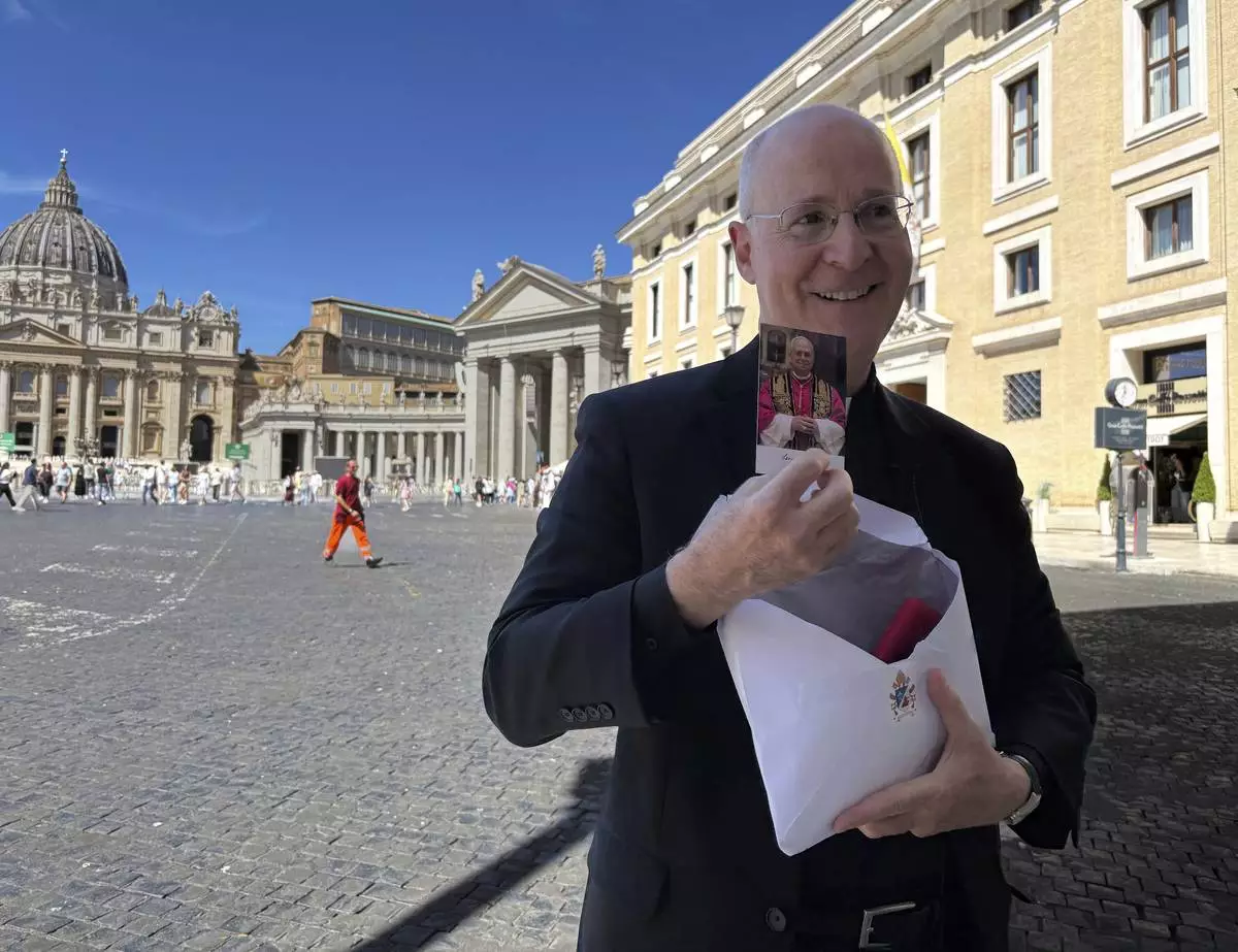 Rev. James Martin, a New York-based Jesuit, shows a commemorative photograph of Pope Leo XIV during an interview with The Associated press just outside St. Peter's Square in Rome, Monday, Sept. 1, 2025. (AP Photo/Maria Selene Clemente)