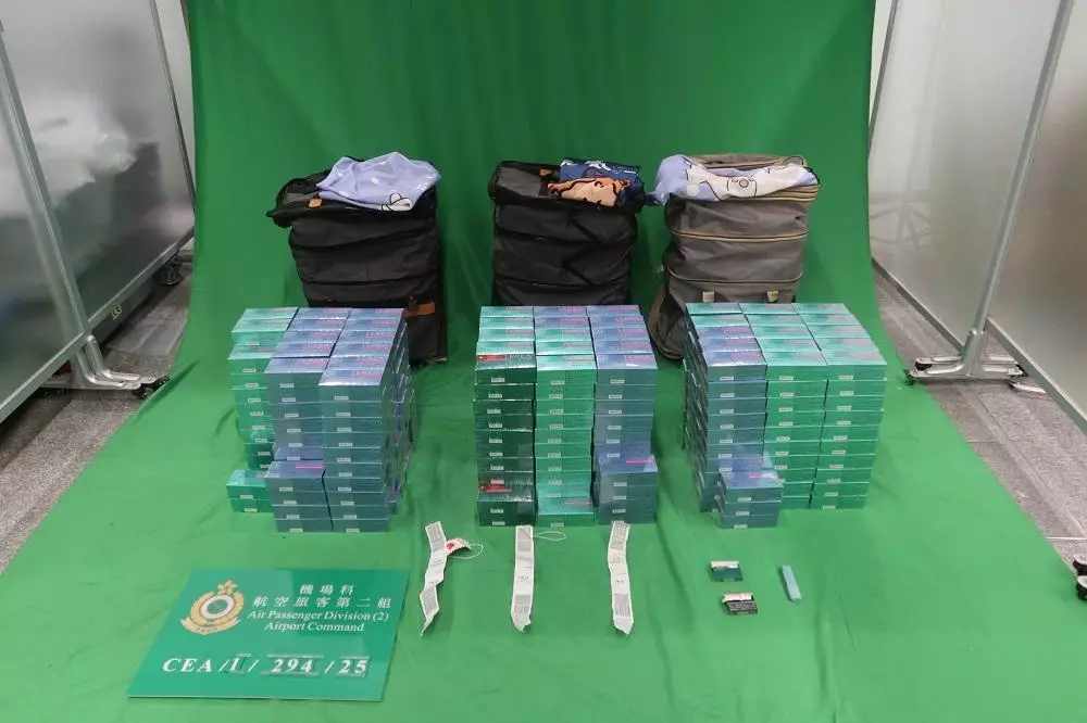 Customs officers intercepted a 42-year-old incoming male passenger at Hong Kong International Airport (HKIA) on July 4 and seized about 92 600 alternative smoking products from his personal baggage with an estimated market value of about $278,000. In addition, Customs officers intercepted a 21-year-old incoming female passenger and a 27-year-old incoming male passenger at HKIA on July 5 and seized about 91 000 alternative smoking products respectively from their personal baggage with an estimated market value of about $546,000 in total. The three passengers were subsequently arrested.