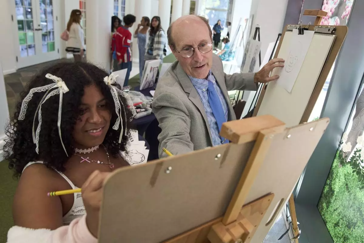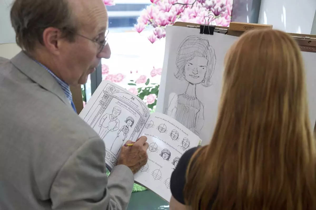 John Hutton, illustrator and professor of art history at Salem College, shows Adelaide Baldus, 16, of La Plata, Md., how to draw a picture of first lady Jacqueline Kennedy, Tuesday, Aug. 12, 2025, from his book, "How To Draw The Presidents and First Ladies," at The People's House, a museum in Washington. (AP Photo/Jacquelyn Martin)