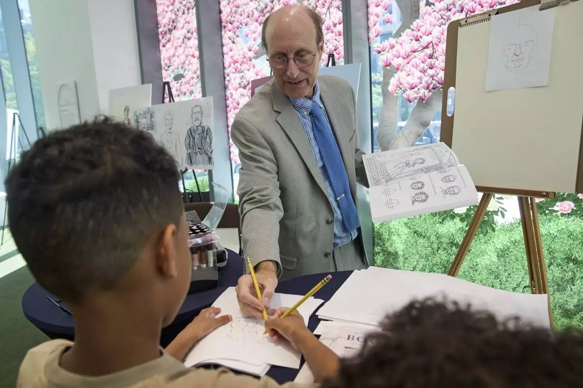 John Hutton, illustrator and professor of art history at Salem College, shows Aidan Santos, 8, of Long Island, N..Y., how to draw a picture of President Abraham Lincoln, Tuesday, Aug. 12, 2025, from his book, "How To Draw The Presidents and First Ladies," at The People's House, a museum in Washington. (AP Photo/Jacquelyn Martin)
