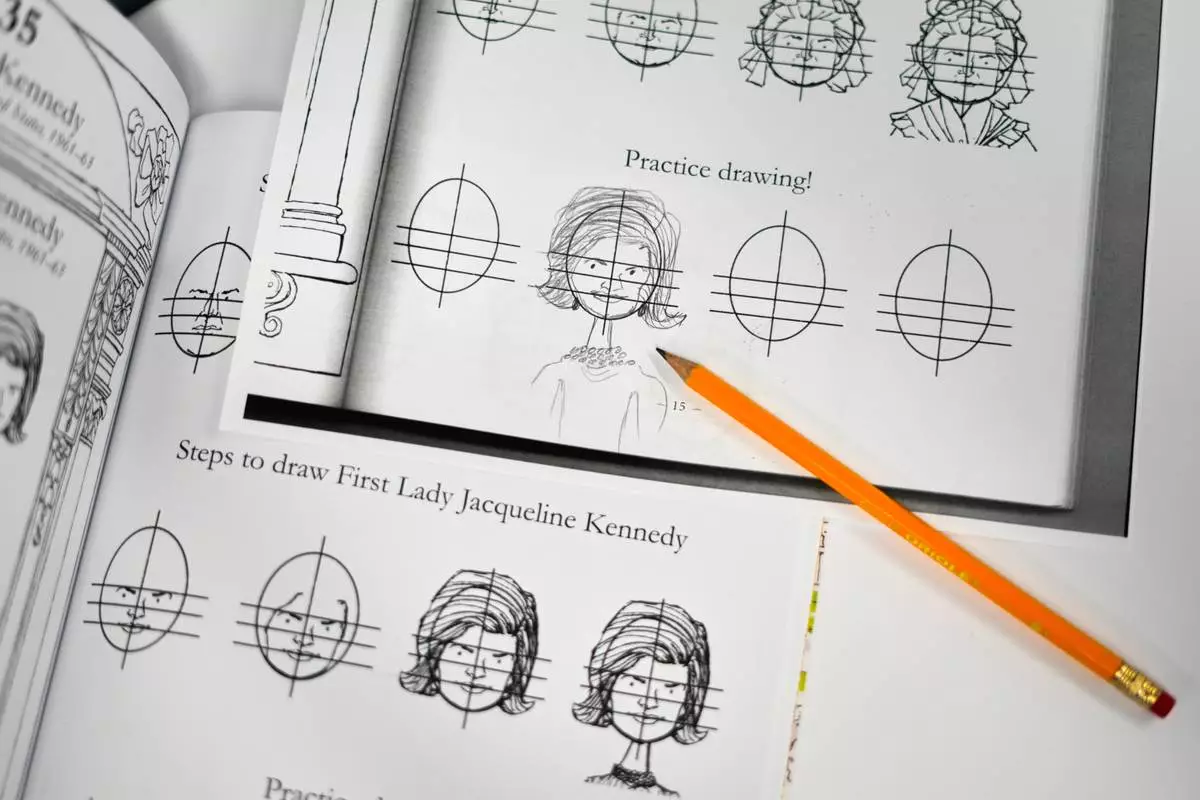An instruction book by John Hutton, a North Carolina art history professor, on how to draw Presidents and first ladies, shown below, and a practice drawing of former first lady Jacqueline Kennedy, drawn by AP White House journalist Darlene Superville, above, photographed Thursday, Aug. 28, 2025 in Washington. (AP Photo/Pablo Martinez Monsivais)