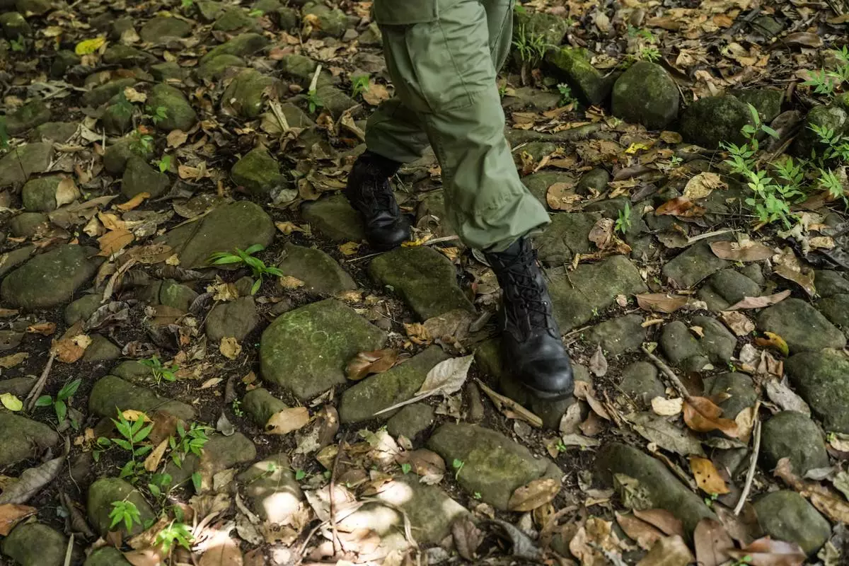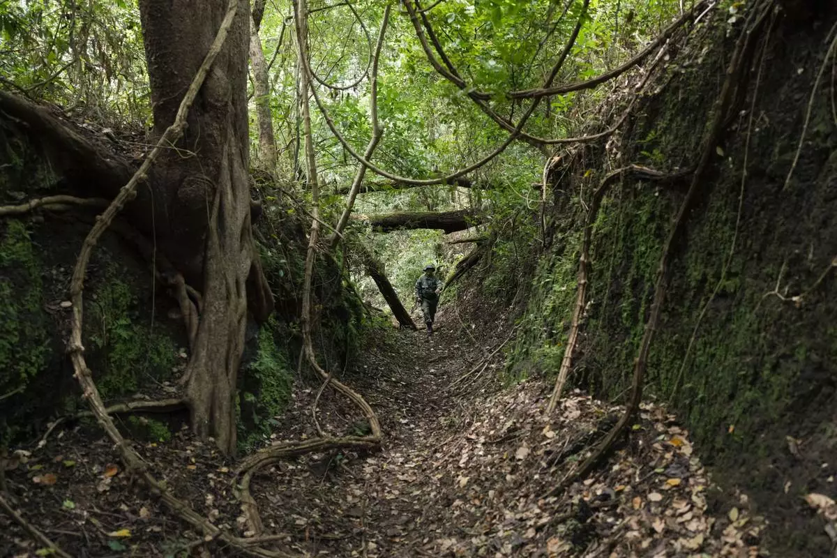 A park ranger walks along the "Camino de Cruces," a colonial road built by the Spanish to transport treasure across the isthmus to the Caribbean for shipment to Europe, in Panama City, Wednesday, Aug. 13, 2025. (AP Photo/Matias Delacroix)