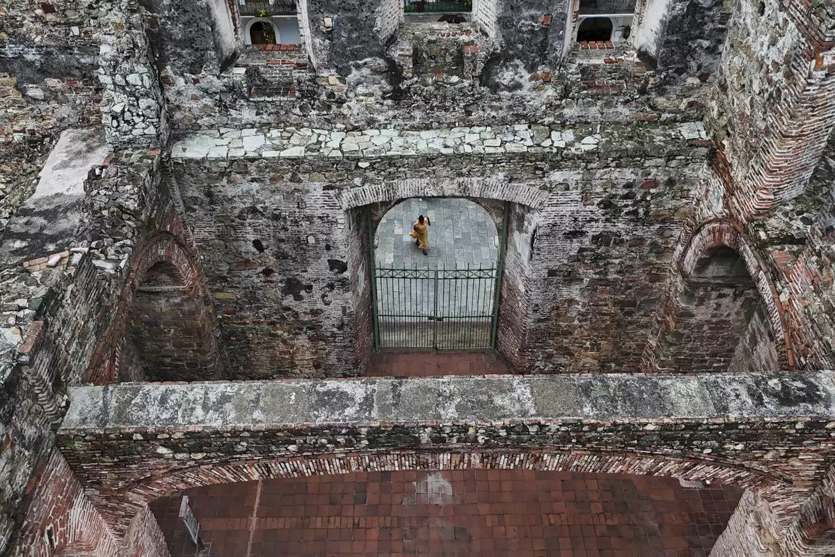 A tourist visits the ruins of Santo Domingo church, built in the 17th century after the city was relocated from its first colonial settlement, which had been destroyed by pirates, in "Casco Viejo," the historic district of Panama City, a UNESCO World Heritage Site, Sunday, Aug. 10, 2025. (AP Photo/Matias Delacroix)