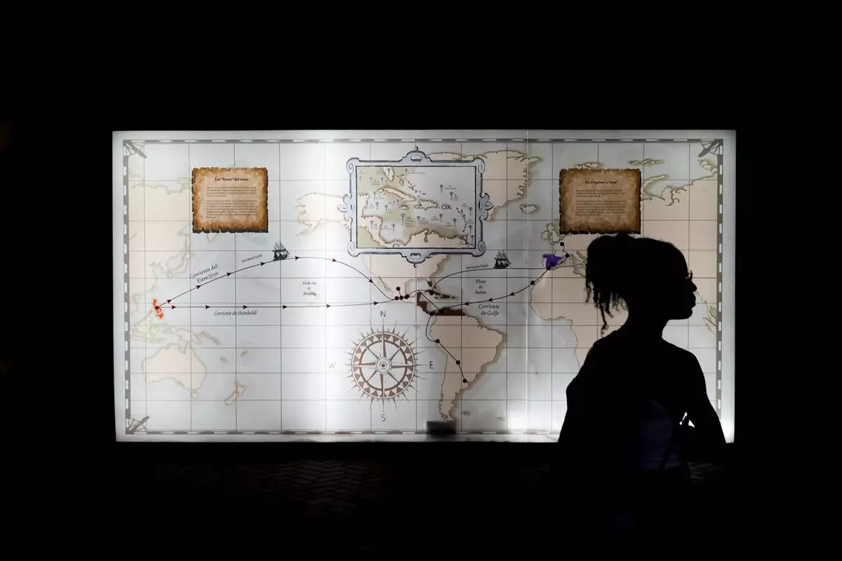 A tourist stands in front of a map outlining colonial interoceanic trade routes at the museum of Fort San Lorenzo, a 16th-century Spanish fortress that guarded the Caribbean entrance to the Chagres River, in Colon, Panama, Tuesday, Aug. 12, 2025. (AP Photo/Matias Delacroix)