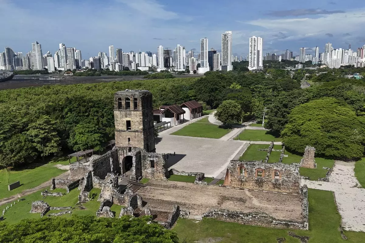 Ruins of the old bell tower in "Panama Viejo," or Old Panama, the first permanent Spanish settlement on the Pacific coast of the Americas, is backdropped by the modern skyline of Panama City, Wednesday, July 30, 2025. (AP Photo/Matias Delacroix)