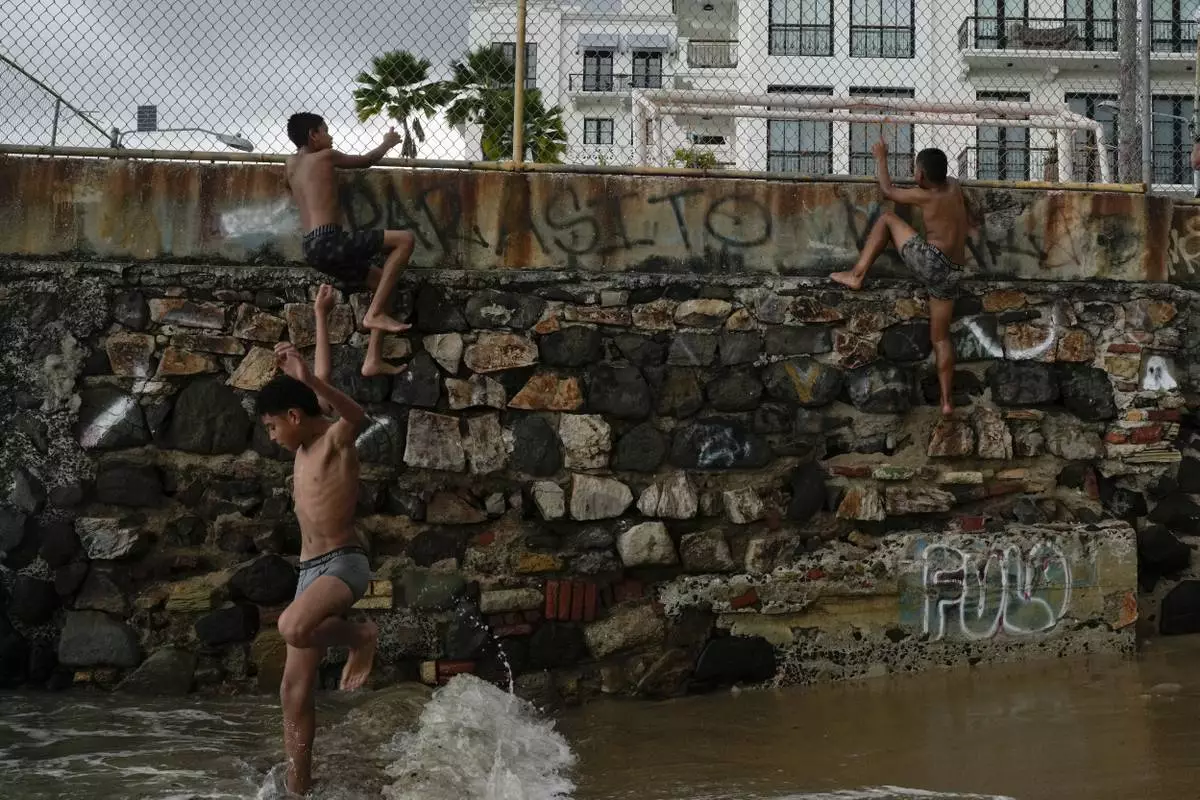 Youths climb a colonial-era wall to dive into the sea in the "Casco Viejo," the historic district of Panama City, a UNESCO World Heritage Site, Sunday, Aug. 10, 2025. (AP Photo/Matias Delacroix)