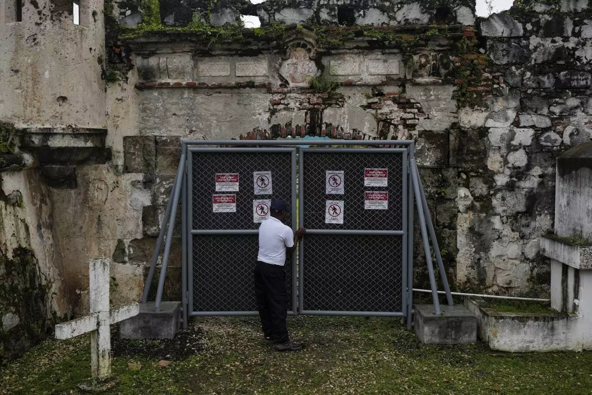 A security guard closes a gate of Fort San Jeronimo, a 17th-century Spanish fort that defended the Caribbean port of Portobelo, where treasure fleets loaded silver and gold for shipment to Europe, in Panama, Thursday, Aug. 14, 2025. (AP Photo/Matias Delacroix)