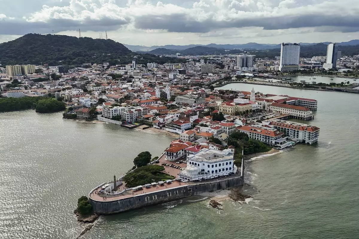 The old town "Casco Viejo" of Panama City, built after pirates destroyed the first settlement, overlooks the Bay of Panama on the Pacific Ocean, Sunday, Aug. 24, 2025. (AP Photo/Matias Delacroix)