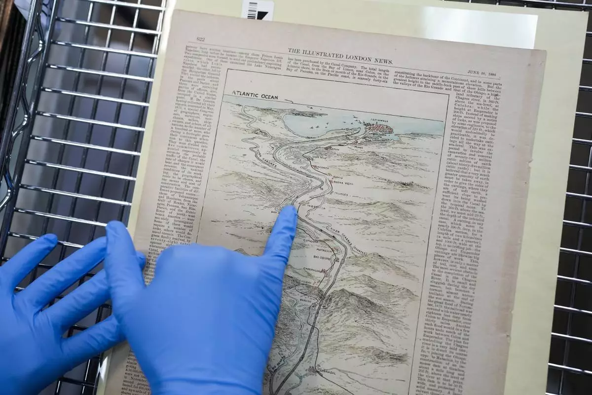 Researcher Esteban Zabala presents an 1888 map of the world's first transcontinental railway, a document that also included early canal route proposals, at the Panama Canal Museum in Panama City, Wednesday, Aug. 13, 2025. (AP Photo/Matias Delacroix)