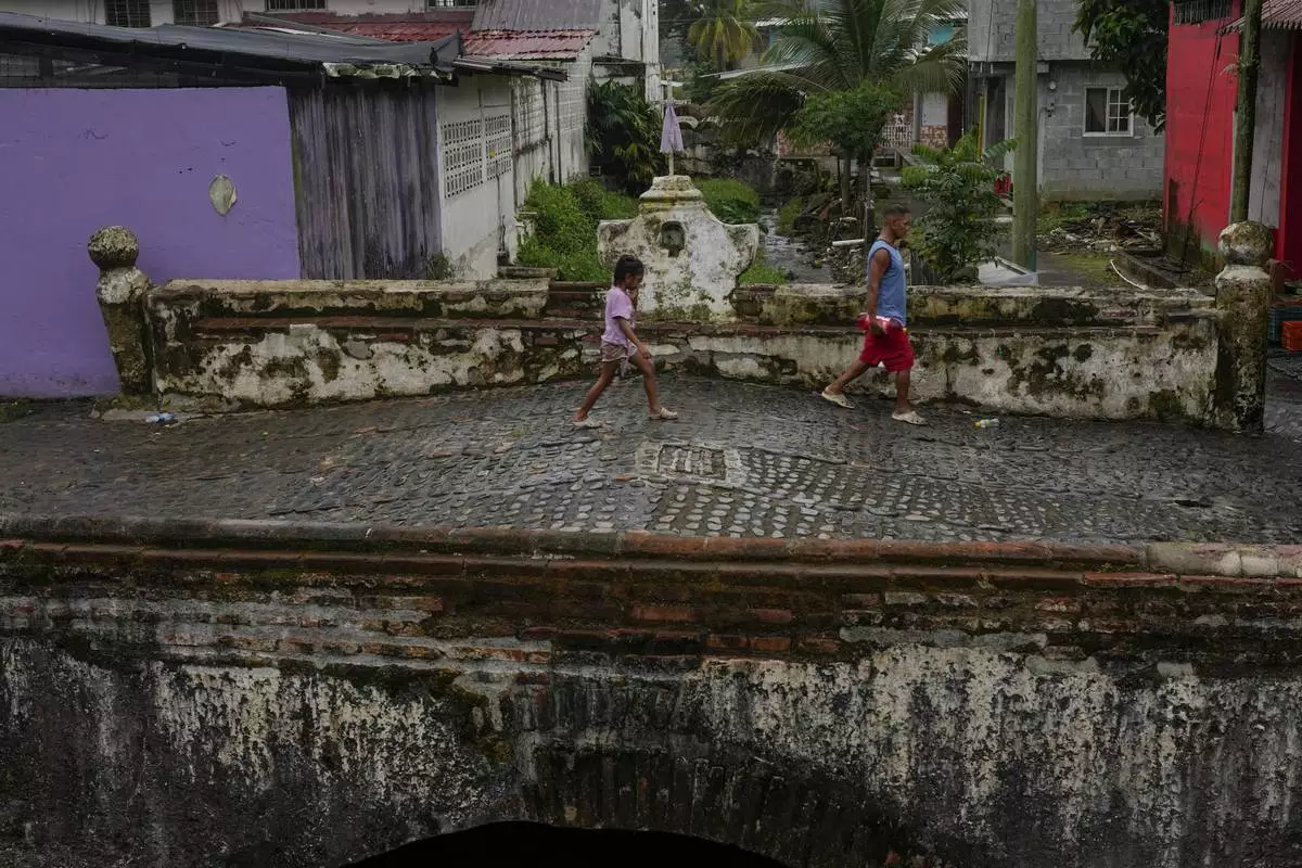Residents cross a colonial-era bridge in Portobelo, a town on Panama's Caribbean coast that was once a key port where Spanish treasure fleets loaded silver and gold for shipment to Europe, Thursday, Aug. 14, 2025. (AP Photo/Matias Delacroix)
