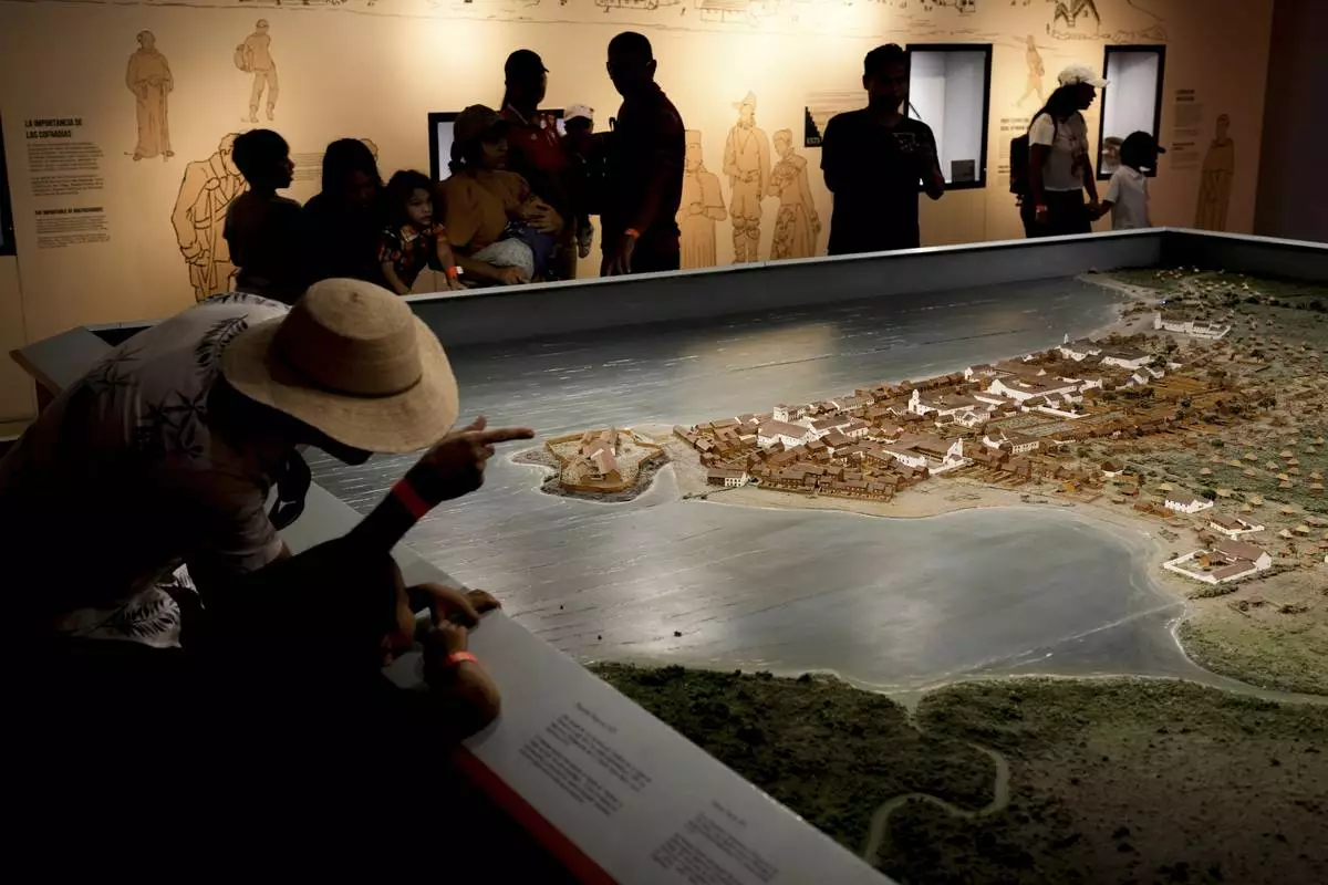 Tourists at the Old Panama Museum look at a topical map of Panama City's first colonial settlement, founded in 1519, in Panama City, Friday, Aug. 15, 2025. (AP Photo/Matias Delacroix)