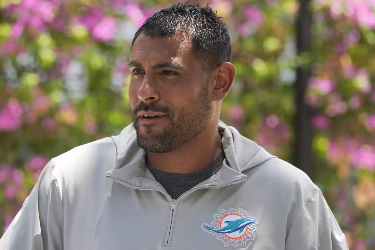 FILE - Miami Dolphins outside linebackers coach Ryan Crow speaks after an NFL football practice at the team's practice facility, June 5, 2024, in Miami Gardens, Fla. (AP Photo/Marta Lavandier, File)