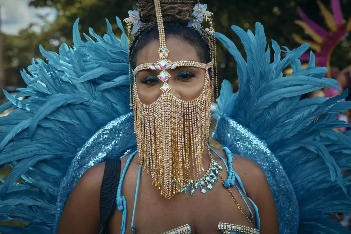 FILE - A reveler poses for a picture during the West Indian Day Parade on Sept. 2, 2024, in the Brooklyn borough of New York. (AP Photo/Andres Kudacki, File)