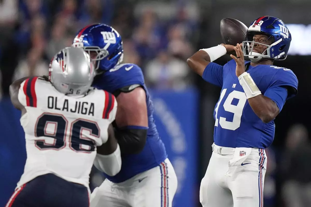 New York Giants quarterback Jameis Winston (19) passes against the New England Patriots during the first quarter of an NFL football game, Thursday, Aug. 21, 2025, in East Rutherford, N.J. (AP Photo/Frank Franklin II)