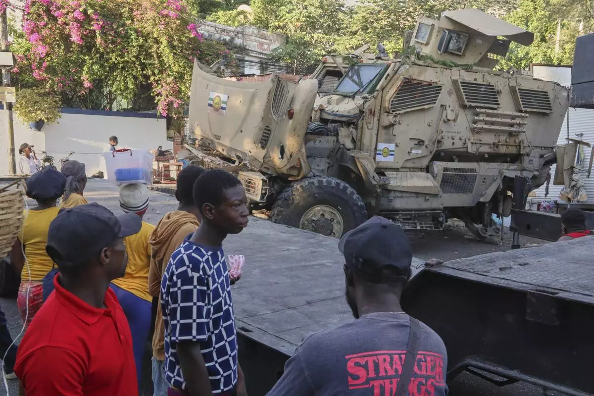 Commuters look at one of two armored vehicles used by Kenyan police, who are part of a U.N.-backed mission fighting gangs, that were involved in a deadly crash the previous day in Port-au-Prince, Haiti, Monday, Sept. 1, 2025. (AP Photo/Odelyn Joseph)