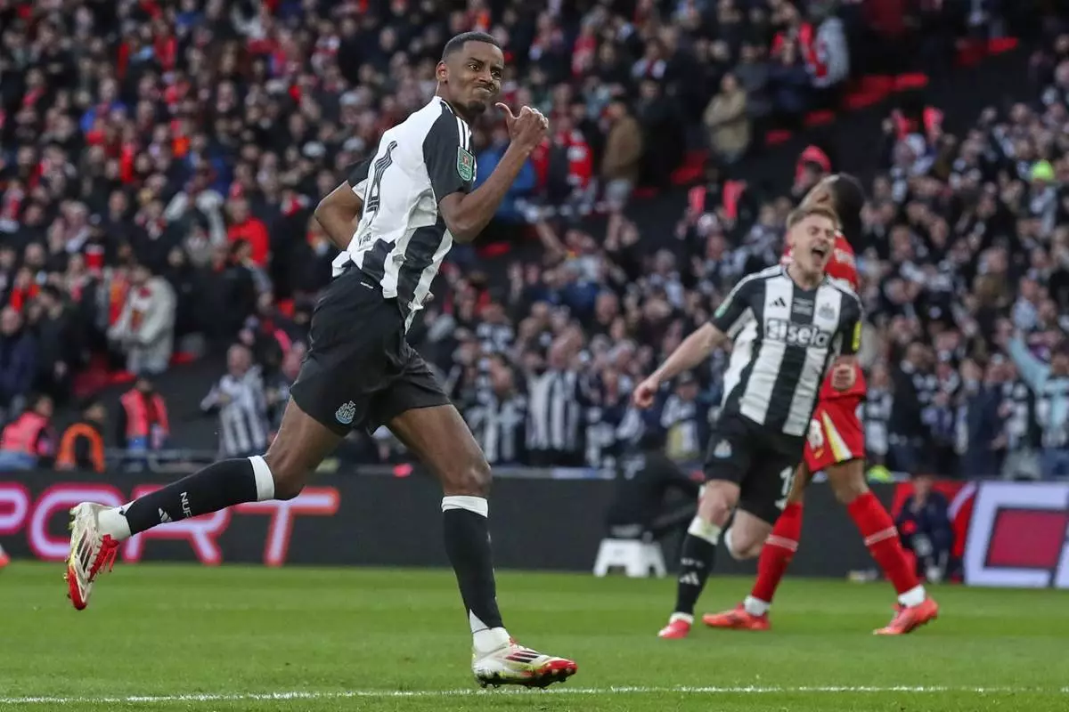 FILE - Newcastle's Alexander Isak celebrates after scoring his side's second goal during the EFL Cup final soccer match between Liverpool and Newcastle at Wembley Stadium in London, Sunday, March 16, 2025. (AP Photo/Scott Heppell, File)