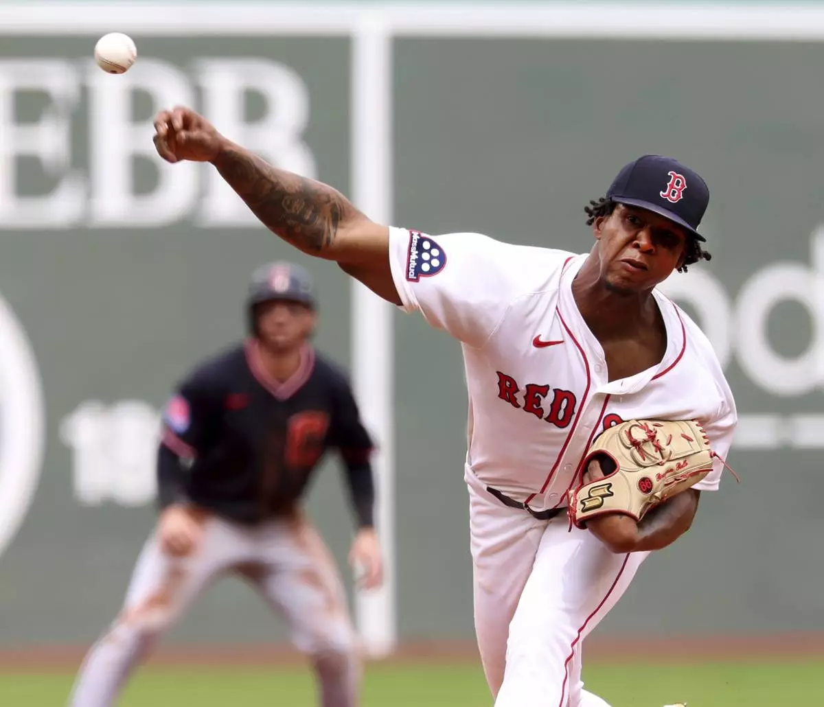 Boston Red Sox pitcher Brayan Bello throws during the first inning of a baseball game against the Cleveland Guardians, Monday, Sept. 1, 2025, in Boston. (AP Photo/Mark Stockwell)