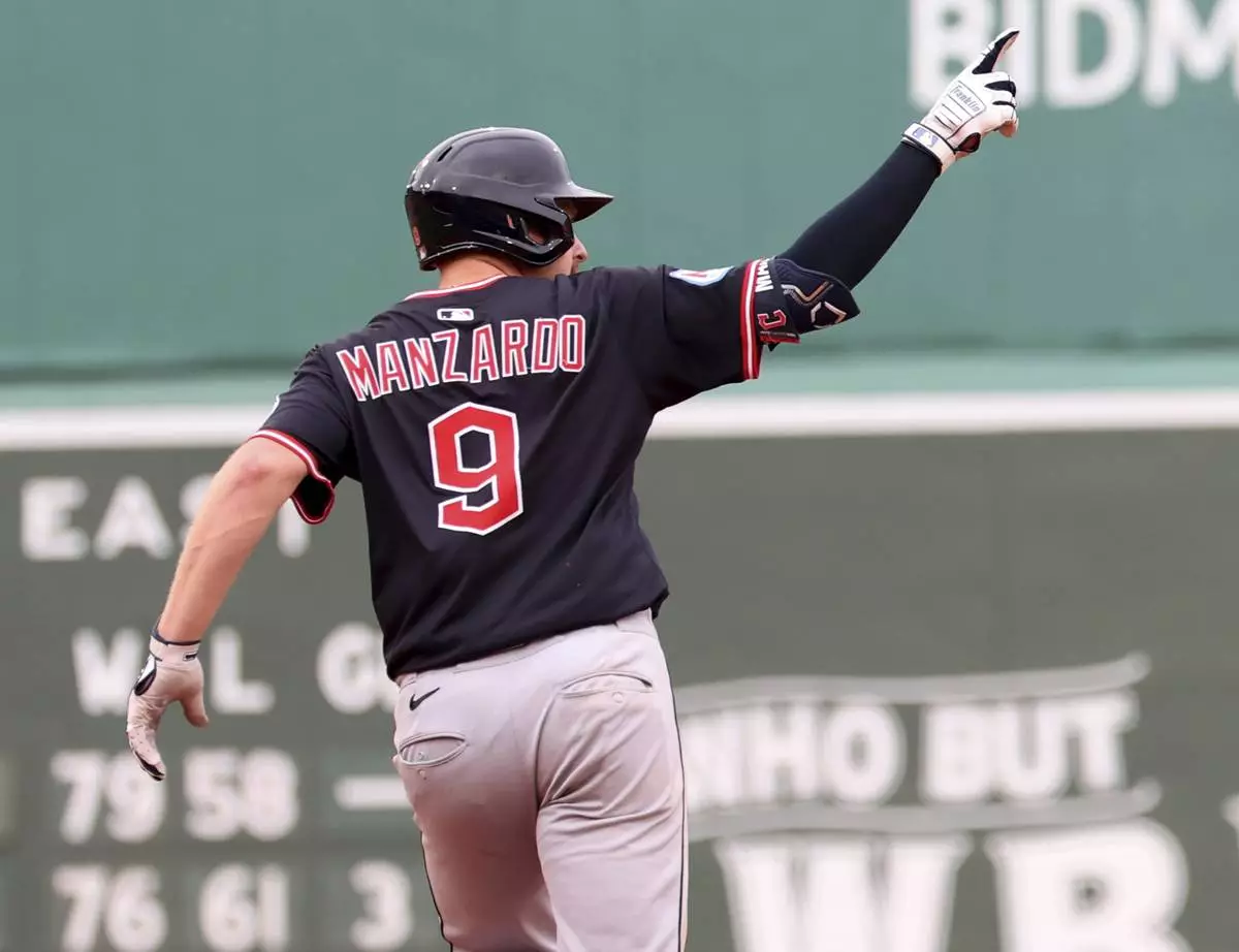 Cleveland Guardians' Kyle Manzardo gestures after hitting a home run during the eighth inning of a baseball game against the Boston Red Sox, Monday, Sept. 1, 2025, in Boston. (AP Photo/Mark Stockwell)