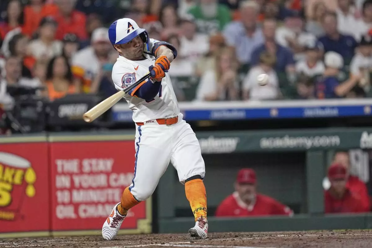 Houston Astros' Jose Altuve hits a RBI double against the Los Angeles Angels during the third inning of a baseball game Monday, Sept. 1, 2025, in Houston. (AP Photo/David J. Phillip)
