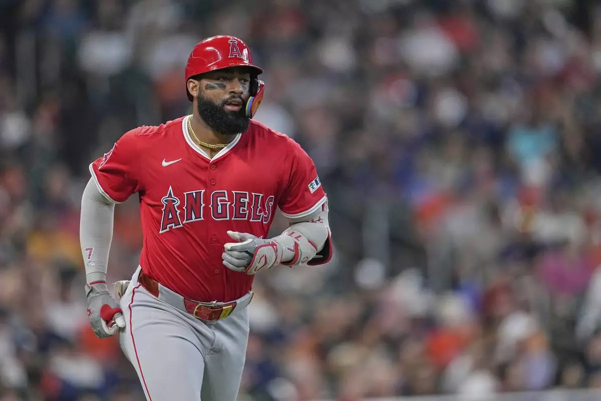 Los Angeles Angels' Jo Adell runs up the first base line after hitting a two-run home run against the Houston Astros during the fourth inning of a baseball game Monday, Sept. 1, 2025, in Houston. (AP Photo/David J. Phillip)