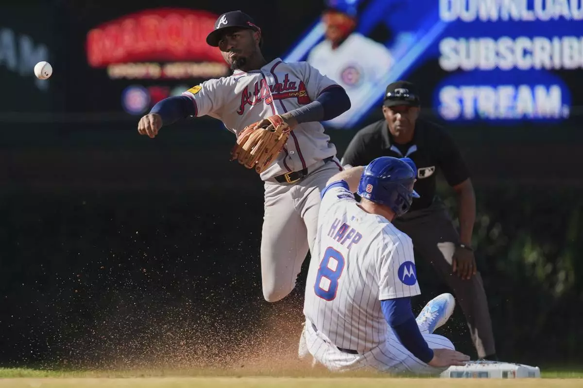 Atlanta Braves second baseman Ozzie Albies, left, throws to first base on a double play-attempt after forcing out Chicago Cubs' Ian Happ (8) during the sixth inning of a baseball game in Chicago, Monday, Sept. 1, 2025. (AP Photo/Nam Y. Huh)