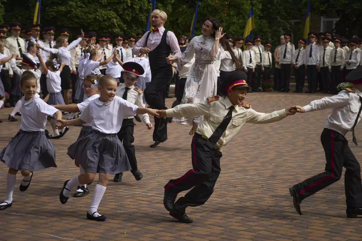 Schoolgirls and cadets dance as they attend a rehearsal of a ceremony on the first day at school at a cadet lyceum in Kyiv, Monday, Sept. 1, 2025. (AP Photo/Efrem Lukatsky)