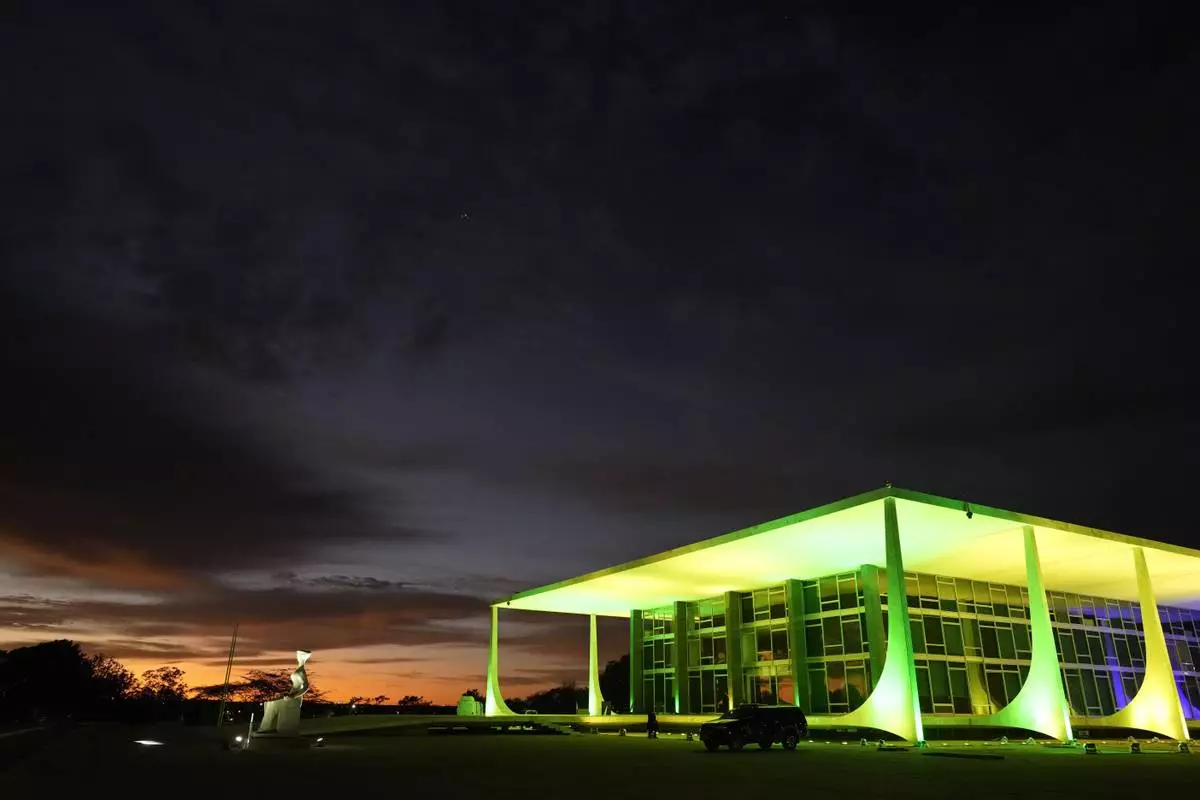 Dawn breaks at the Supreme Court headquarters where the trial of former President Jair Bolsonaro begins in the case for allegedly leading a conspiracy to stay in power, in Brasilia, Brazil, Tuesday, Sept. 2, 2025. (AP Photo/Eraldo Peres)